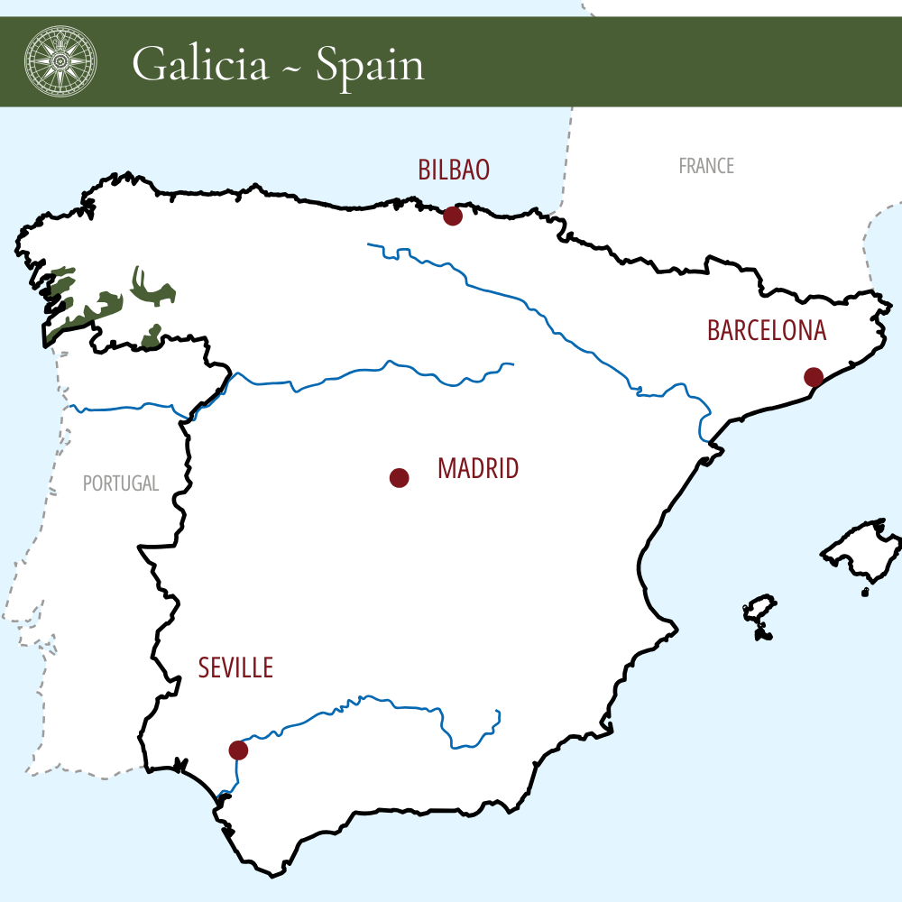 “Etiqueta Verde” clearly demonstrates the quality of the estate, with precision, depth, and a fine balance of floral and mineral flavors. “Etiqueta Ambar”, 100% free run from the oldest vines, is the Granbazan signature wine, the most elegant and complete Albariño! The estate’s special wines are equally exciting if not more. The Veigalobos is an excellent example with very limited Bottles produced for a wine of extreme quality & complexity.
