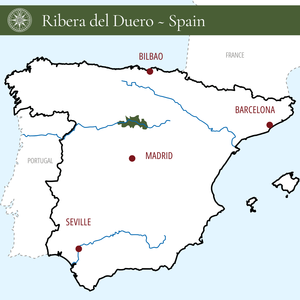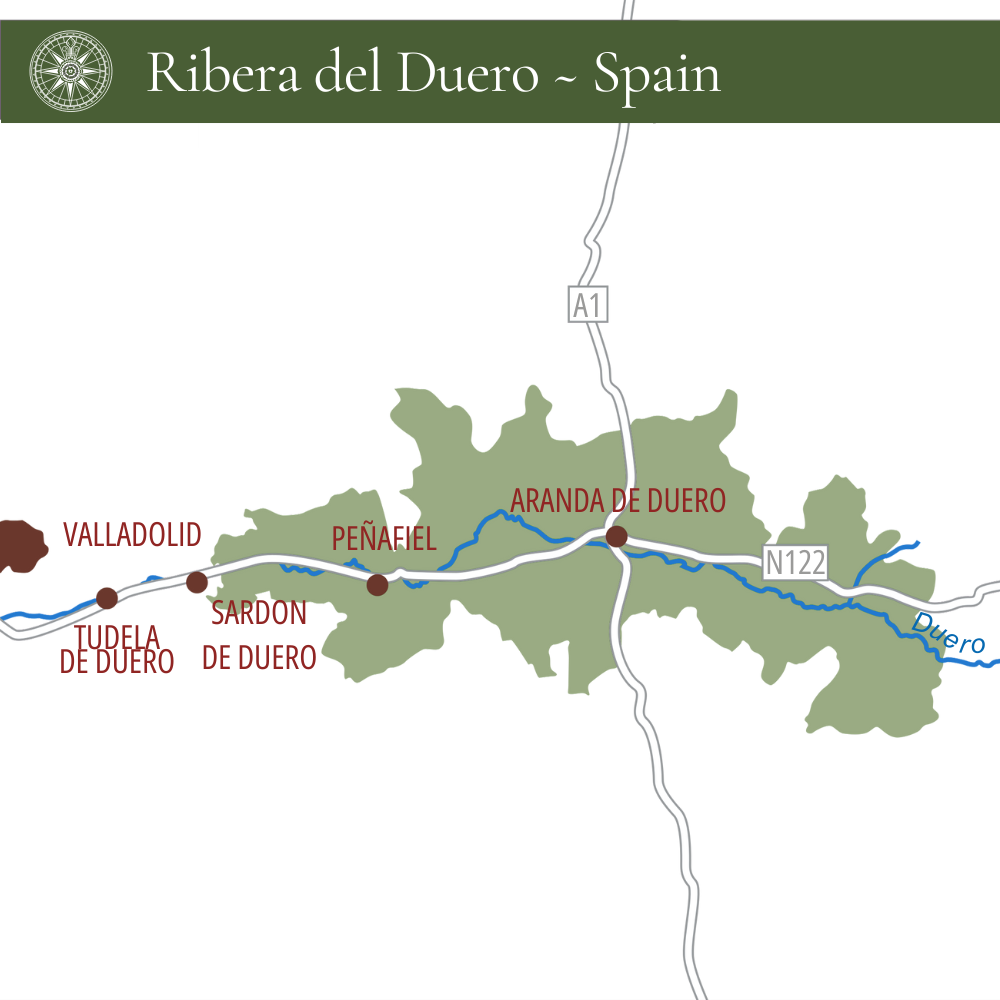 Located in Valbuena del Duero, 30 km east of Valladolid, on the north-facing hillside of the Duero valley at altitudes ranging from 750 to 900m.