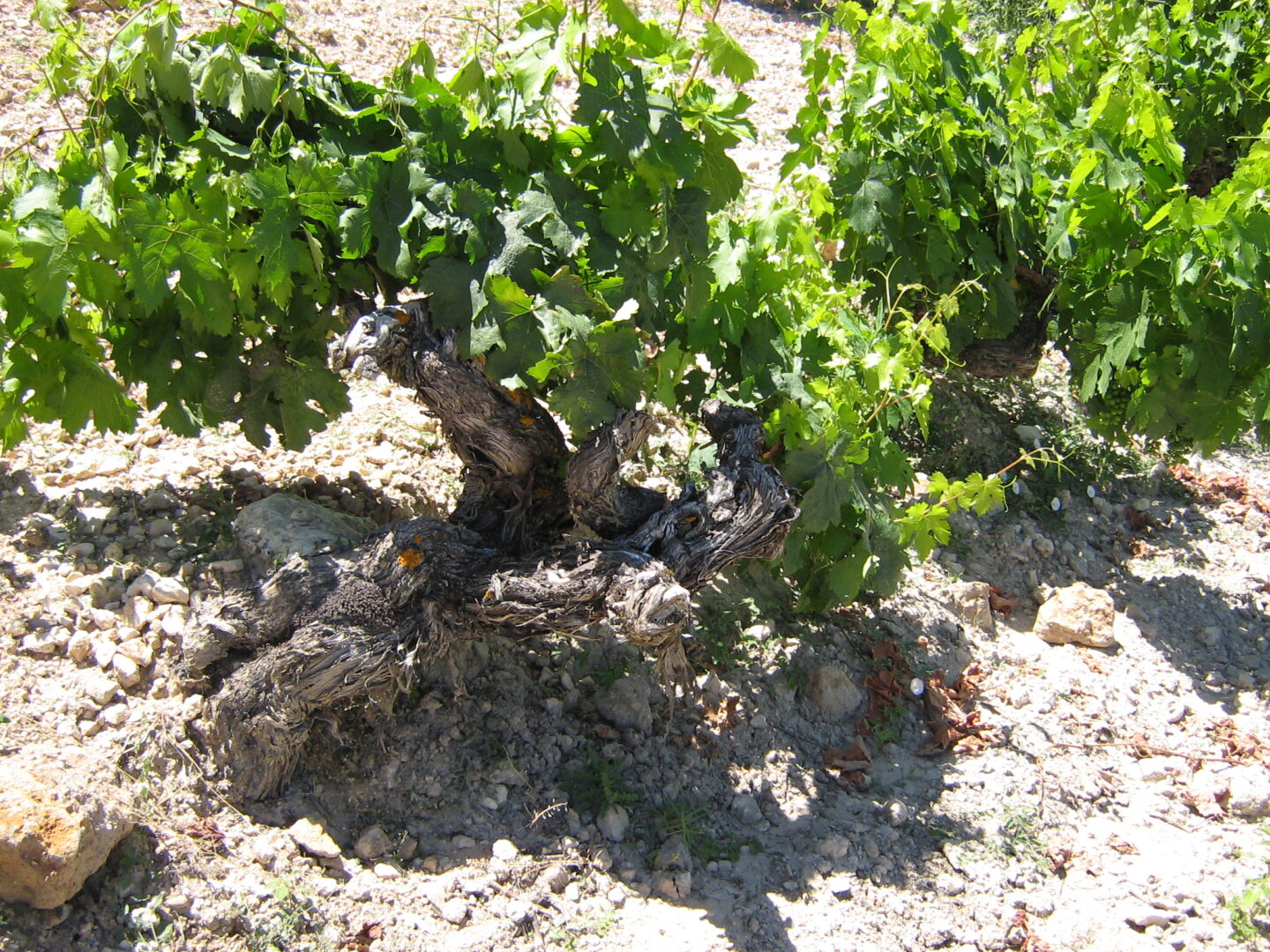 The topsoil is very pale, calcareous clay based. The vineyards occupy the transition zone between the hillside slopes and the alluvial plain. Near the surface, the soil is composed of fine colluvial deposits from the slopes, containing small fragments of limestone. Deeper down, abundant quartz gravel is found within a sandy matrix. Angular limestone boulders are common at the surface. These soils have developed as colluvial deposits on the lower slopes, forming a well-structured profile with a deep calcic horizon resulting from long-term accumulation of calcium carbonate.